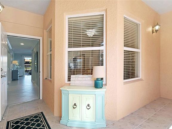 Located on the Rubicon Canal, Cape Coral's largest, Tuscany Village is one of the newest and most attractive communities in this convenient location. Mediterranean style exterior, quality construction, landscaping, lighting, tile roofs and balustrades, create an upscale feel. Inside you will find 9 foot ceilings, cove molding almost everywhere, and diagonal tile with a unique and open floor plan. First floor! No carpeting! Pet friendly (2 under 30lbs)! The spacious screened front entry has a rare extra storage room. Enter into a trayed foyer with recessed lighting. The dining room on your right has triple windows yet is still private. The kitchen boasts tasteful upgrades including recessed lighting, pendant lighting, solid wood cabinetry, SS appliances (most are new) and a spacious pantry. The countertops are Cambria quartz and they are NOT tiered - giving you extra prep space, an open view to the living room and canal, and spacious counter seating. 3 extra cabinets were added to give more than average kitchen storage. The bar stools tuck under the counter for an uncluttered appearance.