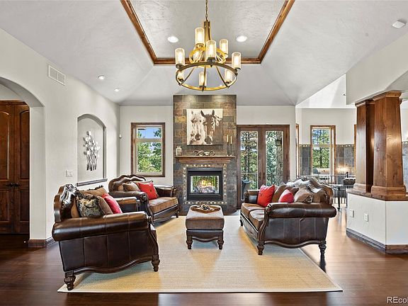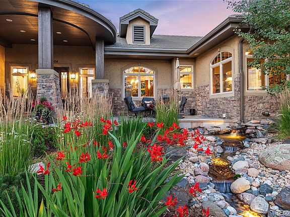 The primary suite features a cozy seating area, double-sided fireplace, and walkout access to the expansive patio with views of the landscaped yard.The spa-like bath includes a jetted tub, multi-spray shower, separate water closet with bidet, and a spacious walk-in closet with built-ins.The finished walk-out basement includes two additional bedrooms (one ideal as an office),a full bathroom with steam shower, theater room with custom lighting, wine cellar, gym with egress, secondary kitchen with wine fridge and space to add appliances, and a second laundry room with sink.Additional highlights include a tankless water heater, two zone-controlled furnaces with humidifier (2019),two A/C units, whole-home water filter, radon system, and completed fire abatement. The four-car garage is split into two bays, each with overhead storage.The backyard offers turf, 52 ceiling lights under the covered patio, and lit stone pillars—ideal for elevated evening entertaining.This exceptional home blends custom design, function, and natural beauty in one of Castle Rock’s most desirable neighborhoods.