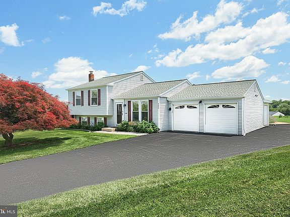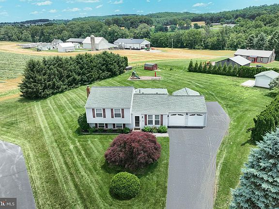 Welcome home to this well-maintained 4-bedroom, 2-bath split-level nestled on a peaceful .78-acre cul-de-sac lot with scenic country views. Enjoy outdoor living with an oversized driveway, spacious 2-car garage plus a 10x14 rear addition, and a large wraparound deck overlooking the level yard, playset and open countryside. The stunning Japanese Maple makes the coolest natural kid's fort! Inside, the main level offers a bright living room with laminate flooring and a ceramic-tiled eat-in kitchen featuring wood cabinetry, breakfast bar, and access to a gorgeous vaulted sunroom. Upstairs you'll find three roomy bedrooms and a full bath with direct access to the master bedroom. The lower level includes a cozy family room with a coal stove, fourth bedroom, full, and laundry. Efficiently heated by a heat pump with central air, plus backup electric baseboard, propane heater, and coal stove for added comfort. A perfect blend of space, charm, and peaceful living!