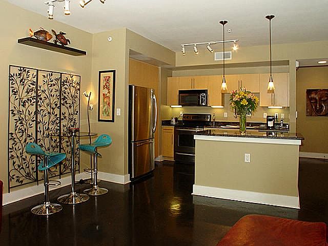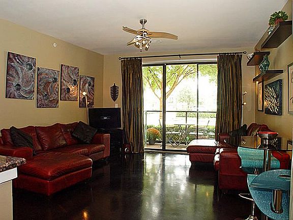 Elegant, understated, sophisticated contemporary ground floor condo with private garage facing tree lined street (not Cedar Springs).Stained, polished concrete floors throughout, open floor plan, 9 ceilings, charming patio. Kitchen has maple cabinetry, SS appliances, granite counters, brushed nickel hardware, large granite island, decorative lighting. Bath has garden tub with new tile surround, walk-in closet and double vanities.