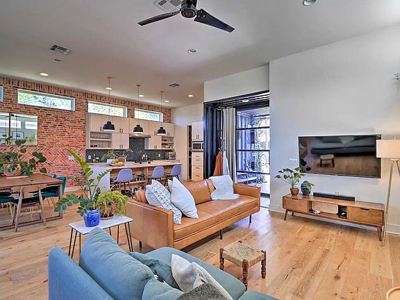 Frida House: Chic, Fully Furnished Urban Retreat in East Austin Frida House is an art-filled, green haven - a quiet, beautiful getaway in the heart of East Austin, minutes from artisanal coffee shops, an eclectic mix of restaurants, breweries and trendy bars on the Eastsde and downtown Austin. Property Highlights: Location: Conveniently located in East Austin, immerse yourself in a neighborhood known for its vibrant arts scene and community feel, with easy access to public transportation and essential services. Design & Layout: Step into a striking living space marked by a bold black shipping container entrance under a jasmine-covered pergola. The house boasts an open-concept living area with towering 12-foot ceilings, adorned with an eclectic collection of global art. The layout is designed to facilitate both privacy and community, making it ideal for families, professionals, and creatives alike. Fully Furnished: Each room is thoughtfully furnished to enhance comfort and style. From the plush king-sized bed in the master suite to the cozy twin in the third bedroom, every piece has been chosen to create a welcoming and homely atmosphere. The living area is equipped with comfortable seating, perfect for relaxing or entertaining guests, and the office setup includes a handcrafted desk for your work-from-home needs. Kitchen & Dining: A chef's delight, the expansive kitchen features a large island perfect for meal prep and casual dining. Adjacent, a sizeable dining table offers a scenic view of the lush, shaded backyard ideal for gatherings and family meals. Bedrooms & Office: Upstairs, the master suite offers a sanctuary with a king-sized bed, an ensuite bathroom with a spacious walk-in shower, and a large walk-in closet. Two additional bedrooms provide comfortable accommodations with queen and twin-sized beds. The third bedroom, equipped with a handcrafted desk and ergonomic swivel chair, doubles as a functional home office. Outdoor Spaces: Enjoy private outdoor living with two upper decks that offer leafy views and glimpses of the downtown skyline perfect for sipping your morning coffee or enjoying an evening glass of wine. The serene backyard, with its live jasmine wall and majestic oak tree, invites you to relax, entertain, and connect with nature. Additional Features: Essential home utilities include high-speed internet, in-unit laundry facilities, and central air conditioning and heating. The property is pet-friendly, subject to approval. Why Frida House? Frida House is more than just a rental; it's a fully furnished lifestyle choice for those looking to combine home comfort with an active urban life. Ideal for a couple or small familes this house adjusts to your pace and style. Lease Terms: - Available for a 12-18 month lease - Security deposit and background check required - Tenant to pay for utilities - Pet security deposit of $700 per dog, up to 2 dogs - House comes furnished (some furniture can be removed upon request)