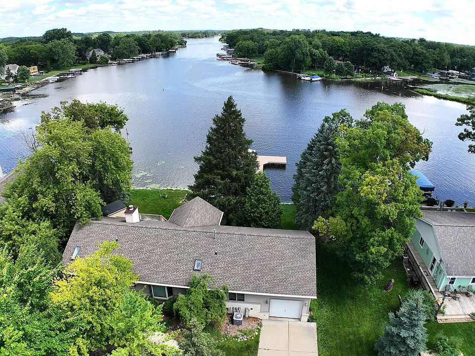 Lake Living at its' finest! This almost 3000 sq ft walkout ranch is nestled on an end road with 120+ ft of stunning Fox River Frontage! Toes in the sand, w/ a newer stone shoreline & a 2023 pier includes a boat lift & a boat! As you enter, the walls of windows showcase the glistening water w/ an expansive NE river view. Soaring ceilings & an open design offers a fantastic space for entertaining in the KIT featuring Corian counters & a light airy feel. A cozy FP creates an area for relaxing after spending a day outside. A sunlit sunroom overlooks the water & a Primary en-suite offers a Lg BA w/ tiled shower & jetted tub. A private door to the newer maintenance free deck is a great place to start the day w/ a cup of coffee or watch the sunset later in the day.
