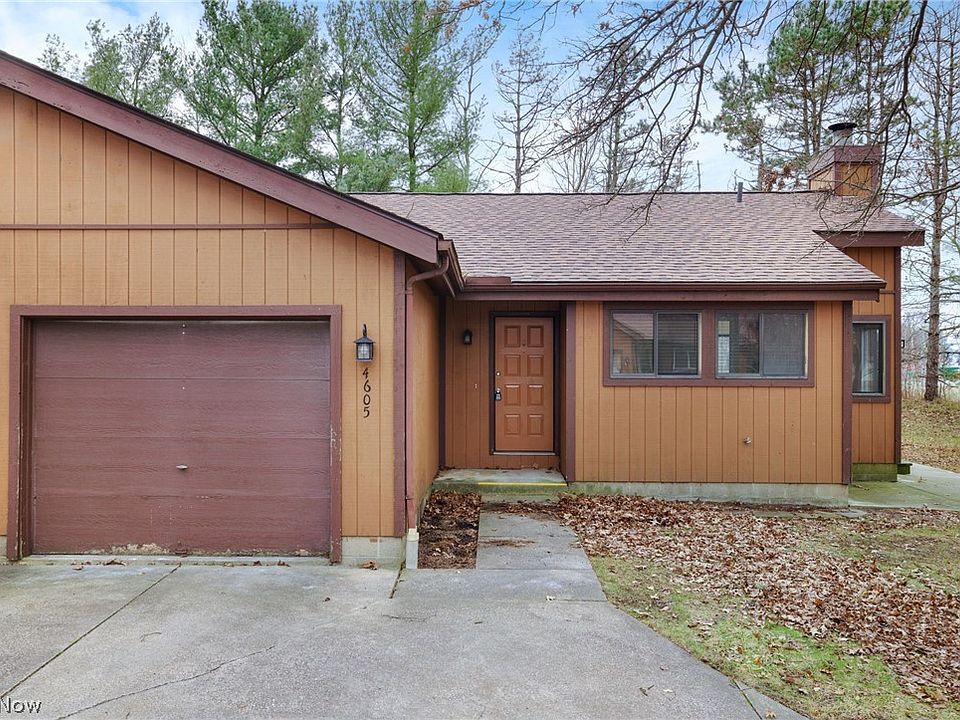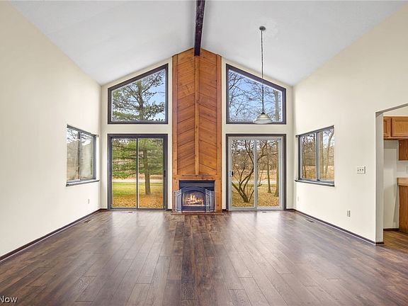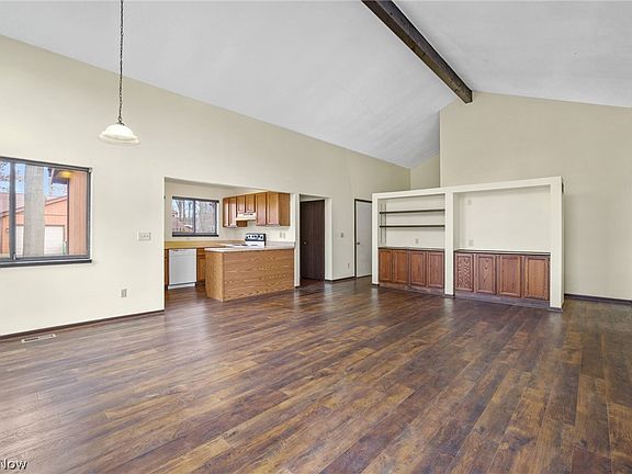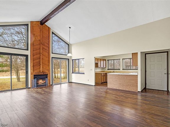Located in the wooded Wrens Cross neighborhood in Stow, this cozy & airy home features 2 beds, 1 full bath, and a wonderful open floor plan. High vaulted ceilings greet you as you enter inside. Enjoy an easy flow from the spacious living room to the eat-in kitchen. This open living room space features wood beaming, a gorgeous original wood burning fireplace, a wall of windows with serene views, and custom built-in cabinetry. The kitchen includes ample storage with a dishwasher & oven, and room for bar seating. Newer flooring leads you to both bedrooms with neutral painted walls and plush carpeting. Additional storage can be found in the basement or create the space of your dreams. Schedule your private showing today!
