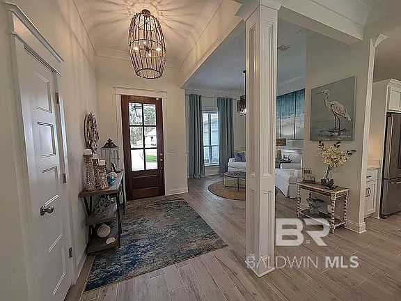 Experience coastal luxury in the heart of Orange Beach, AL's Shore Acres subdivision. This custom Truland Limitless craftsman-style home offers 4 bedrooms, a keeping room, and 3 full bathrooms. The gourmet kitchen features custom crafted cabinets, quartz and granite countertops, stainless steel appliances including a gas range, and a large island with a breakfast bar and breakfast nook. Wood plank tile flooring graces the main living areas, master bed, and bath, as well as the secondary bathroom. The master bath boasts separate walk-in closets, a double vanity, a separate shower, and a garden tub. With 10-foot ceilings in the main living area and a 9-foot trey ceiling in the master bedroom, this home exudes spaciousness and sophistication. Additional features include wood shelving in all closets and the kitchen pantry, a gas fireplace with a brick surround, crown molding, cased windows and doors, and a tankless hot water heater. Built to Gold Fortified standards, this home also includes a Ring security system, potentially saving you money on homeowners insurance. Outside, the home's exterior features board and batten siding, a durable metal roof, and a tongue and groove ceiling over the front entry and large rear porch. The backyard is a private oasis with a custom gunite pool boasting waterfall features and a tanning ledge with 2 water loungers. A custom-built gazebo covers a large hot tub, surrounded by napoli pavers and lush landscaping. The entire yard has been professionally landscaped and features irrigation in all grass areas and flower beds. Conveniently located near restaurants, shopping, parks, and the Orange Beach Rec Center, this home offers easy access to all that Orange Beach has to offer. Plus, with the beach just 2.5 miles away, you'll have endless opportunities for coastal enjoyment. Don't miss your chance to own this gorgeous home and experience luxurious coastal living firsthand!Seller related to agent. Buyer to verify all information during due d