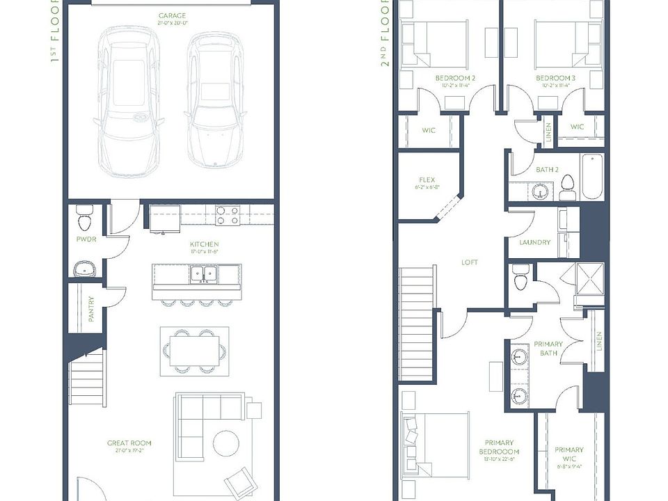 Our modern-inspired, contemporary two-story townhomes feature abundant two-tone bronze windows, sophisticated brick combinations, and ergonomically planned spaces for a seamless blend of indoor and outdoor living. This community showcases garage Front Entry (FE) homes with a private backyard and garage Rear Entry (RE) homes with a front courtyard.