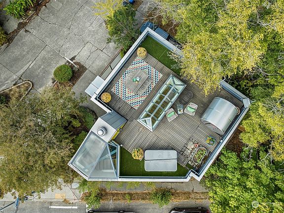 Come see this house! This Graham Baba-designed custom build is perfectly situated btwn neighborhoods & sits high above street and is beautiful & delightful blend of both shipwright's quality & artist creativity. Has enchanting apt. w/king bed nook, hand-crafted sliding doors, kitchen & charm galore too! Rooftop sky portals light up this special home from top to bottom. Dine, garden & relax in sauna/hottub on rooftop deck. Stunning views of Lk Union, Rainier & dwntwn from multiple floors. Radiant flr heating, on-demand H2O, refinished hdwds, AC +eco-friendly recirc system, outdoor patios, sweet shed for bins, custom corrugated fencing. Many options for ground floor space w/electric car outlet & sound-proofing: or 2nd apt/gym/office/garage?!