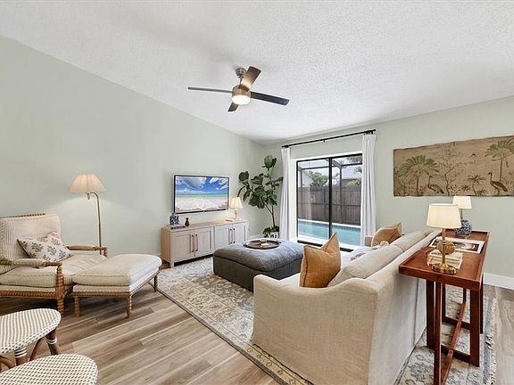 Stylishly updated and meticulously maintained four-bedroom, two-bath pool home, ideally on a quiet cul-de-sac in one of West Bradenton’s desirable neighborhoods. Entering inside, you’ll discover a bright, open floor living space with vaulted ceilings, luxury waterproof vinyl plank flooring and glass sliders leading to the pool. The modern kitchen is a culinary haven, featuring shaker-style cabinetry, quartz countertops, stainless steel appliances, a breakfast bar, closet pantry for storage, striking tri-color subway tile backsplash and reverse osmosis system. The spacious primary suite offers private access to the covered patio, a spa-inspired en-suite bath with a seamless glass shower, custom tile finishes, a dual sink quartz vanity and stone-style finish tile flooring. Three additional bedrooms provide ample space for a growing family, guests, or a home office, each with updated closets. Guest bath exhibits new mosaic tile flooring, updated vanity and subway tile finishes in the shower and tub. Enjoy your own backyard oasis with a screened-in refinished pool deck and resurfaced pool (2024), covered lanai, new sod and a fully fenced yard, ideal for entertaining or relaxing in privacy. The home is equipped with a fully functional well pump and newer irrigation system, offering lush landscaping without the water bill. Additional upgrades include fresh interior paint and modern baseboards, new ceiling fans and closet doors throughout, and expanded attic storage. Plus, an oversized driveway with two-car garage, newer HVAC (2022), low HOA fees and community pool. Built to withstand Florida’s toughest weather, this concrete block home in Flood Zone X sustained zero damage during last year’s hurricane season with no lost shingles, no flooding and peace of mind, according to the owner. Just minutes from GT Bray Park, IMG Academy, top-rated golf courses, Bradenton Christian School and the world-renowned beaches of Anna Maria Island, this home offers a blend of comfort, style and location. Don’t miss this rare opportunity to own a move-in-ready pool home in a prime location with thoughtful upgrades and exceptional care throughout.