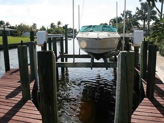 AWC - Taking Backup Offers This canal front home features 3 bedrooms, 2.5 baths and an oversized 2 car garage. This large great room floor plan has vaulted ceilings with a view of the water. The kitchen has been remodeled to include solid surface counters and newer appliances. The dining area off the kitchen is bright and sunny. The screened lanai off the kitchen and dining area is sunny and bright in the morning and shaded in the evening. Walk out to you walk around dock to watch the sunrise. The deck will hold a 40' boat and has a 20,000 lb lift . The deep saltwater canal is your gateway to the great waters of the Gulf Coast. The indoor utility leads to half bath just off the garage. The garage is oversized and will hold 2 vehicles and a golf cart or your motorcycles. The side yard is large enough to store a trailer or a couple of Jet Skis. This homes is conveniently located to shopping and the beaches of Anna Maria Island. Newly painted exterior 12/15. Seller has a home warranty available.