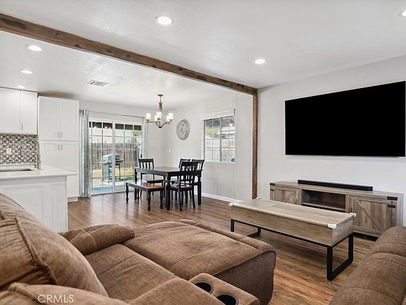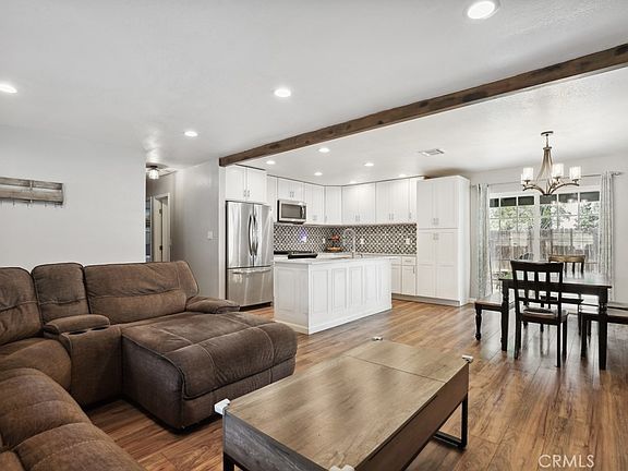 Charming single level, fully fenced home with no HOA fees and located directly across the street from many hiking and biking trails at Challen Park is ready to be made yours! The interior has been highly updated and offers an open and spacious floor plan with beautiful beamed ceiling, recessed lights, baseboards, crisp white paint, and wood plank flooring. The light and bright living room flows into the dining area and remodeled kitchen with center island offering breakfast bar seating, white cabinetry, and custom tile backsplash. The dining area offers a slider to the backyard and chandelier light fixture. This home features 3 bedrooms including the primary suite which has a large ceiling fan and open concept ensuite with relaxing soaking tub and updated vanity with mirror. There is also an updated hall bathroom with walk-in shower offering on-trend subway tiling for the 2 secondary bedrooms to share. Enjoy the private backyard with concrete area for your patio set and BBQ, there are also fruit trees and grass - this space is ready for the new owner's design. This home also has an attached 2-car garage and plenty of driveway parking for guests! Conveniently located near shopping, dining, and not far from the 91 Fwy