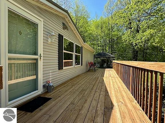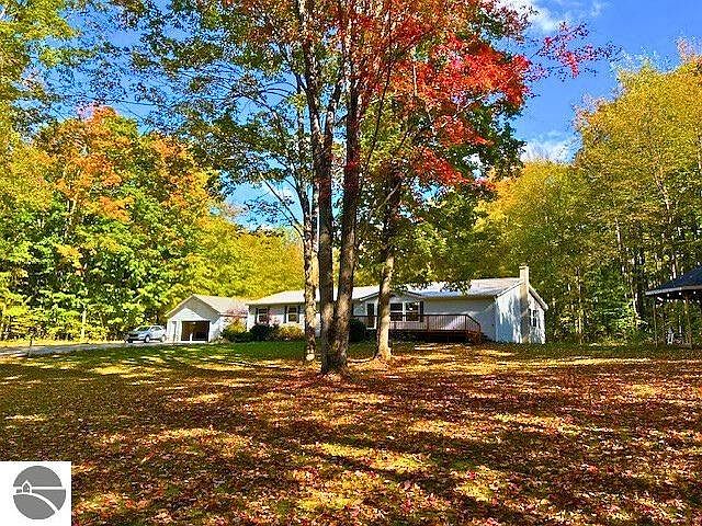 Nestled just outside of Bellaire, this 4 bedroom, 3.5 bath home offers a peaceful wooded oasis on nearly 4 acres. Features laminate flooring throughout the main floor, open kitchen with island, family room with new electric fireplace, spacious master bedroom with private bath, newly painted walls, full, completely encapsulated basement with 2 large, finished craft/hobby/workshop rooms and built-in bar area, Beautiful landscaped yard, outdoor gazebo and 24x44 insulated, detached garage w/new lighting and opener. Many new updates in 2024 including rain gutters, furnace, AC unit, hot water heater, refrigerator, stove, dishwasher, washer/dryer, new kitchen lights, new bath fans, air ducts cleaned, new entry door, new storm door, newly stained front deck and more. All just minutes from Shanty Creek Resort and Hawks Eye Golf Course.