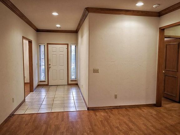 Low maintenance living awaits in this quiet gated community. With lawn care provided and the garage located in the back, this home has no shortage of curb appeal. A large entryway leads to a formal dining area that could easily double as a study. The generous living area boasts a beautiful fireplace and French doors that lead out to a private patio and backyard. The kitchen boasts granite countertops, a stylish backsplash, walk-in pantry, additional eat-in area with French door access to a side porch. The laundry room leads out to the double car garage located in the back of the home accessed through a back entry, with an in-ground storm shelter and insulated garage door. This three bedroom home has a split plan with a private primary suite with a door that accesses the back porch, large walk-through closet with 2 entrances, and an en-suite bath with separate shower and jetted tub, and double vanities. Two additional bedrooms and a hall bath offer ample space for family and guests. The home showcases beautiful woodwork, crown molding and tile flooring. The private backyard offers a serene retreat enclosed by a brand new fence. This well-maintained home in a private, quiet gated community offers a wonderful opportunity to enjoy a comfortable and stylish lifestyle.