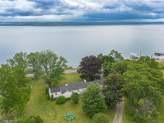 Impeccably maintained ranch home set of nearly 6 1/2 acres of land and almost 240 feet of private shale Cayuga Lake frontage. Set on a tree lined approach, the home features 4 spacious bedrooms and 1 1/2 baths, an attached one car garage, large dry basement with family room/rec room plus plenty of storage. The house is highlighted by the original heartwood floors throughout, original millwork, two wood burning fireplaces and more! Entering through the spacious foyer, the main level features a bright kitchen space with views out to the lake, 1st floor laundry closet, a formal dining room offering plenty of space to entertain. The main living room/great room extends to full width of the house offering expansive water views and access to the large three season room. All 4 main floor bedrooms offer great closet space, one with on-suite half bath, plus a separate den/office area. Property is being sold turn-key, fully furnished, with a successful short term rental history!