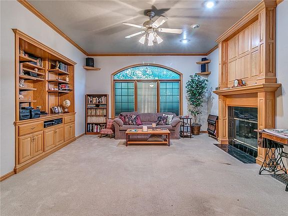 GOLF COURSE LIVING with easy access to two 18 hole golf courses! This one owner custom built home has been well-maintained and recently painted inside and out! A nice circle drive provides extra parking. Mature trees line the front of the property with a pond on the westside and peaceful unobstructed views from the large covered back patio. Spacious living room has crown molding, built-in custom cabinets, fireplace, and surround sound. Kitchen boasts a large center island that provides plenty of workspace in addition to a breakfast bar. The dining area has built-in custom cabinets, a window seat, and provides space for a large dining table. Master and secondary bedrooms offer great space, too. The home is also equipped with sprinkler and home security systems.