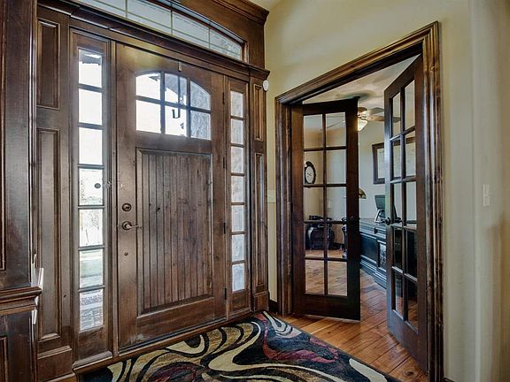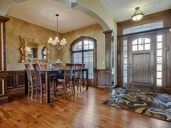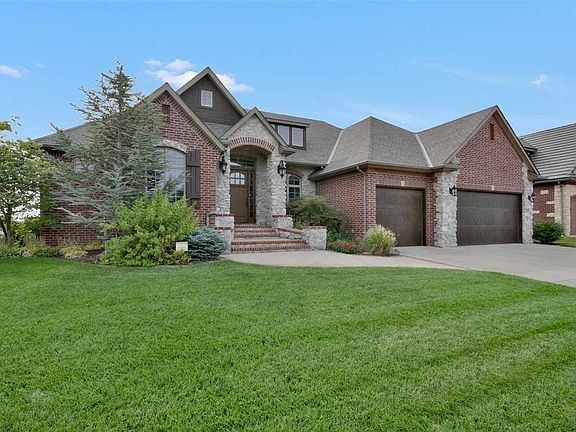 No expense spared in this former model home in Emerald Bay; West Wichita's sought after boating/skiing lake community. East facing backyard overlooking the scenic 100 acres of lake. Dramatic wood work throughout this home gives it a rich warm feeling. The unique floorpan features a main floor office, ideal for a home business, in addition to the 3 main floor bedrooms. The 17' x 15' master bedroom has a fabulous bathroom with granite counters, a walk in shower, corner soaker tub and a dream closet as well as a private door to the deck to have your morning coffee overlooking the huge green space and lake. The 2 additional spacious bedrooms share a Jack & Jill bathroom. High vaulted beamed ceilings, formal dining and a must see chef's kitchen featuring granite galore, an eye-catching wood tray ceiling, top of the line gas range with a pot filler and its own fireplace! Hardwood floors throughout the formal dining, kitchen, office and hearth of the main floor. In the living room, along with the soaring ceilings, you find a see-thru gas fireplace that allows you to enjoy views of the lake while warming by the fire or to enjoy the fire while spending fall evenings on the deck after coming off of an afternoon on the lake. Main floor laundry, spacious hidden walk in pantry and guest bath with granite countertop round off the main floor. The full finished walk out basement is open and spacious and features the homes 3rd gas fireplace, a beautiful built-in entertainment system, an oversized wet bar that features a 2 drawer dishwasher, built in microwave & mini fridge and a walk in wine cellar/additional pantry with room for a full size fridge and could be a cool set up for wine tastings. This home was made for entertaining! Bedrooms 4 & 5 in the basement share the 2nd Jack & Jill and a guest bathroom services the main basement areas. Unlike any other home currently for sale in Emerald Bay this lot includes a boat slip which equals a savings of over $30,000.00, the wrought iron fence will save you another $5k-$8k and the special tax payoff on this home is close to 1/2 that of brand new homes in the area making this home a smart financial decision.