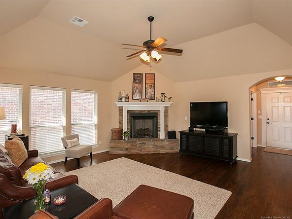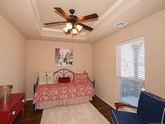 Custom Home backs to Jackson Park! First time on the market, single level home and full of upgrades. Tucked away in a cul de sac in Castlegate. This home features wood floors, a flex room, great room open to kitchen, split bedroom plan and 2.5 garage. Kitchen has island, pantry, stainless appliances and plenty of storage. The master suite is spacious and master bath has plenty of storage with his/her vanities. Floor plan is perfect for entertaining yet cozy enough for a quiet evening by the fireplace. The flex room located off the foyer has French doors and could be used for an office, library, play room, exercise area, craft room or guest bedroom. Home features a covered patio, mature trees, and great view of Jackson Park. There is access to a greenbelt, walking trails, pond, and Jackson Park from the backyard. Great location close to 91st & Hwy 169, Saint Francis South, and shopping corridor. Call listing agent Kim for to schedule a showing 918-724-5522 Union Schools.