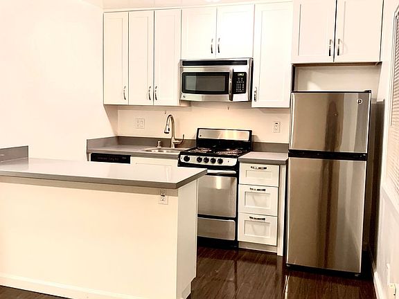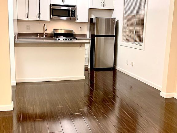 This beautifully renovated studio apartment is the only one of its' kind at this property and a true must see! Located on the top floor corner of this 2 story property, this is situated in the ideal part of the property - no upstairs neighbors and only sharing one wall with neighbors. The spacious main living space features several double paned windows that allow for plenty of natural light and dark laminate hardwood flooring throughout. The space is large enough to accommodate a queen size bed and other furnishings for a cozy living space. The open concept kitchen features stone quartz countertops, white shaker-style cabinetry, and stainless steel appliances that includes a refrigerator, microwave, electric range stove/oven, and even a dishwasher! There's also room for bar top seating! The unit's bathroom is also updated with charming white honeycomb floor tiles and a tub/shower combination. This neighborhood gem will likely rent quickly!
