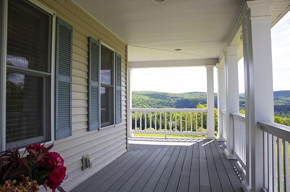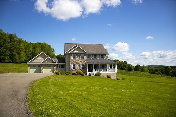 Stunning custom built home on 19+ acres w/panoramic views offers covered front porch- gleaming hdwd flrs & new furnace. Open floor plan has LR w/2 sided gas frpl-maple kit w/new SS appls & granite counters-large breakfast bar & new French drs to deck. Master suite w/balcony & gas frpl-mud rm w/pet shower-finished walkout LL-20x14 screened porch-36x36 barn w/4 stalls-3 pastures-stocked pond.