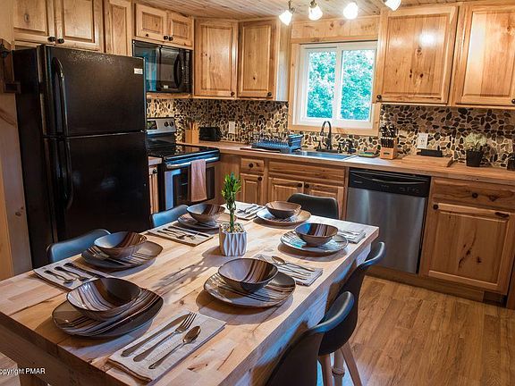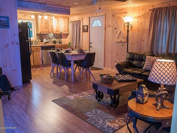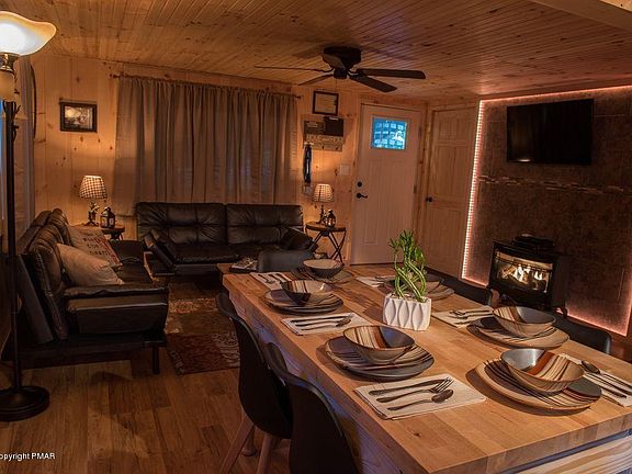 ANOTHER MONEY MAKER that made $56K between June 2018 to August 2019! Rental home comes as a turn key operation. Furniture, advertising and book of business. Notice the ship lap, stone work, tile, rich wood accents, custom built beds, barn door- everything you need to have a truly rustic yet elegant stay in the Poconos! 2 Bedrooms, 1 Bathroom, hot tub, patio, front covered porch & rear deck, firepit area and playset offers a fun spot for everyone to enjoy. This house is a dream come true and don't miss its sister house right next door which is also available for sale and is a successful rental income property.
