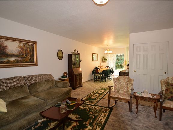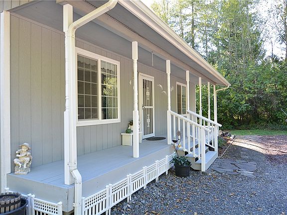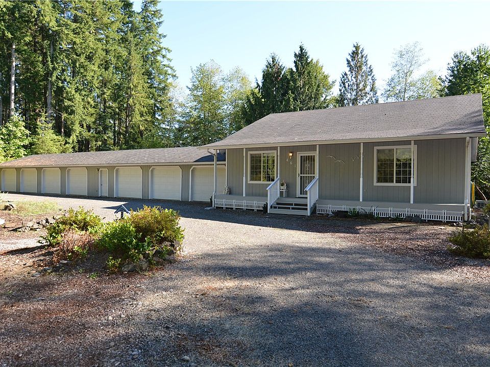 Fabulous home featuring seven garages for the car enthusiast! Meticulously kept home in a quiet country location boasting 1,296 SF, 2 spacious bedrooms, 3 bathrooms, great room living w/large living rm & kitchen w/eating space & slider to private covered back deck, large utility rm, vinyl windows, heat pump, 3 garages w/front and back garage doors, apartment area in garages w/living space & 3/4 shower, large circular driveway, mature landscaping, on 2 acres with river & mountain views!