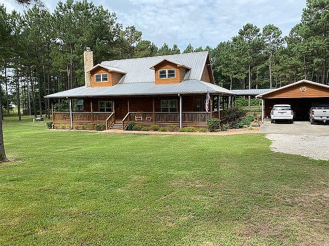 This beautiful, spacious, and cozy metal-roofed home is the perfect house to soon call home. Starting with a 700ft driveway, this house sits on a picturesque 8 acre lot that features a wrap around porch, 3 oak porch swings, an attached carport with both walk in and attic storage, a 16,000 gallon in-ground pool, and so much more. In addition to the 15x33ft pool, the backyard comes with a full kids play set, a beautiful and spacious gazebo next to a green covered pergola, and 30x60ft fenced in area perfect for any pet to safely run free in. In the back corner of the property, there is also a 30x24ft shop with running water and electricity perfect for an additional workspace or outdoor covered storage. On the first floor of this 2 story home you’ll find an open concept plan complete with custom cabinetry and granite counter tops in the kitchen, a walk-in pantry, and a half-bath that connects the south side of the house to the north. The custom solid wood desk by the stairs allows for space to work and additional storage. With the exception of the grand vaulted ceiling located above the den, the ceiling height throughout the home is comfortable 9ft tall. The master bedroom is located adjacent to the main living area and boasts a large walk-in closet as well as a luxurious dual headed walk-in shower. The second floor contains two spacious bedrooms as well as a full bath, all connected by an intimate gathering space.