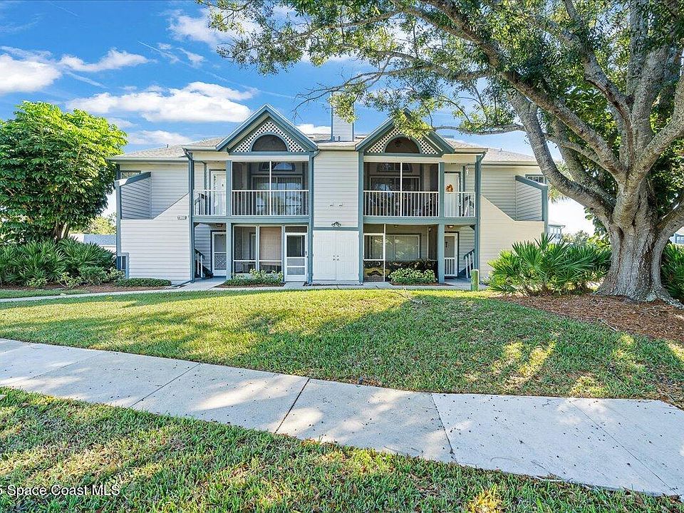Perfect Location for easy access to I-95 , shopping, parks, downtown Melbourne & a short drive to area beautiful beaches. Welcome home to this ''move in ready condo'' (end unit) on 2nd level. Featuring an open plan design with family room, dining area, and newly updated kitchen with designer coastal color cabinets, granite countertops, tile backsplash, and a pass through / bar area. Main bedroom just off dining room with private bathroom and walk in closet. Wood look Tile plank flooring throughout. A quaint screened in front balcony has views of lake and faces community clubhouse / pool / tennis courts area. Access to laundry space is just off the balcony. Spacious Loft area can be used as 2nd bedroom, office or Flex space. Full bathroom just off the loft. Other features include: ceiling fans, window coverings, sky-lights, decorative mirror in dining area & storm door at entry. HOA includes: water, cable, i-net, roof, exterior paint. New A/C 2024 & breaker box with surge protector .