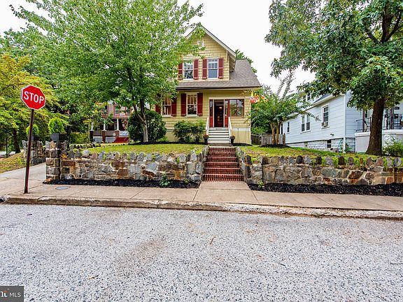 25K Price reduction! Truly one of a kind Craftsman home perched on a corner lot beautifully landscaped in the historic Baltimore community of Lauraville. This home has been lovingly maintained and features many original details including working transoms, period light fixtures, door knobs, shutters, screens, built-ins, and architectural woodwork. A cozy glass enclosed porch welcomes you in with beautiful stained-glass accents around the front entrance. The generous entry foyer features original hardwood floors with detailed inlay extending throughout the main level. Spacious and light-filled formals with graceful arched opening framed with wood columns provide the perfect place for hosting and gathering. Den adjacent to the dining room can easily double as a bedroom. Thoughtfully updated eat-in kitchen features all stainless steel KitchenAid Designer Series appliances, marble top island, white painted original cabinets, adjacent breakfast or reading nook, and access to enclosed back porch overlooking a sprawling backyard with detached one car garage and pergola. Circular stone focal point offers potential for water feature or raised flower garden - a charming touch to the fully fenced yard! Upper level with beautifully updated full bath, linen closet, and two generous bedrooms both with extra-large closets and cozy nooks; ideal for dressing or sitting areas. Secondary bedroom features attic access with stairs for additional storage. Full, unfinished basement includes utility sink, Samsung front loading washer/dryer, and 1/2 bath offering potential for additional finished living space. Updated with central air, programmable thermostat, and storm windows, this home is impeccable and move-in ready today!