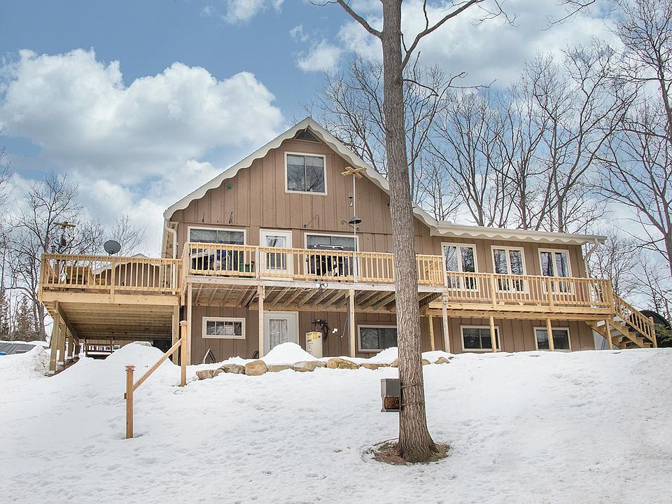 Completely remodeled 3 bedroom home on Lake of the Hills. A custom build kitchen with hickory cabinets welcomes you when you enter and then unfolds across the lakeside with tongue and groove pine. Spacious and full of windows. to take in the water views. No worries here as almost everything is new and is hooked up to a full home generator. A gravel path along the side of the home drives right down to the shoreline for those with ATV's or golf carts. Upstairs has 2 bedrooms with a 1/2 bath and the lower walkout level gives you plenty of storage space a studio suite or rec room with mini fridge, counter & cabinetry. Quonset type portable storage shed is included along with the pier. Great location just north of Eagle River so you are close to everything but far enough away to enjoy the Northwoods.