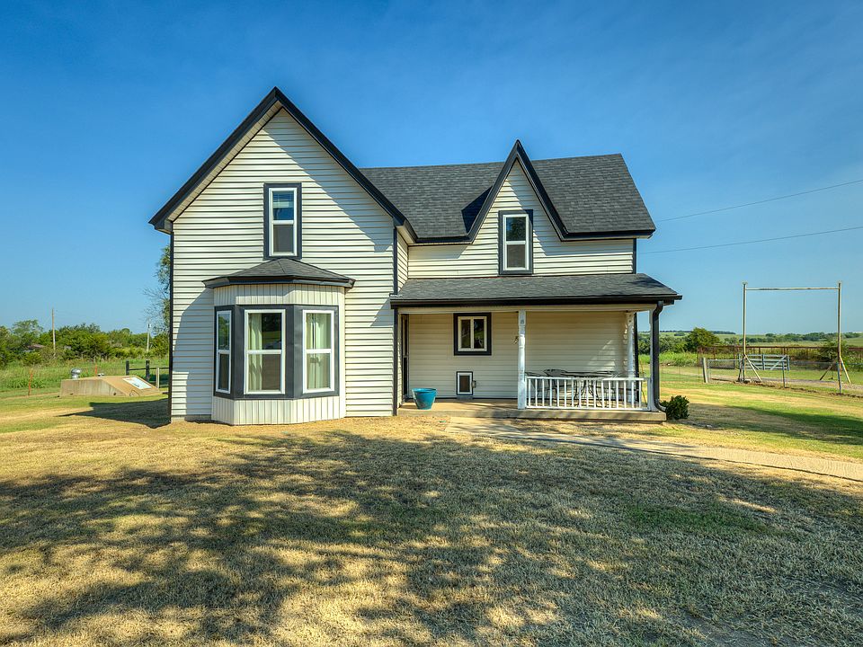 Gorgeous 3 bedroom 1 1/2 bath with option of 4th room, sitting on 10 acres in the country. Recently remodeled inside and out, all new flooring, lighting fixtures, ceiling fans, windows, roof and siding. Kitchen was taken down to the studs has all new cabinets, counter tops, flooring and appliances. Tile and hardwood flooring throughout. Hot water tank had been replaced with tankless hot water heater. 3 bedrooms with option of 4th bedroom, laundry room with sink and storage area. Perfect covered porch to sit and enjoy a morning cup of coffee or afternoon cup of tea on. Fenced in yard for pets and or children. 24X30 Garage with electric garage door opener, storm shelter close to house for those stormy days. Property includes pond with fish, creek, cattle pin and barn, hog pin and chicken pin. Concrete pad where another building can be added for storage. Wildlife includes turkey's and deer. Security Camera's do not convey with property. Sellers will pay $500.00 for Home Warranty Owner is a licensed real estate agent.