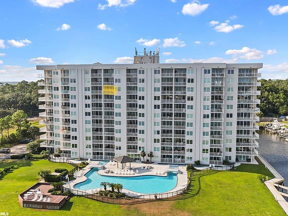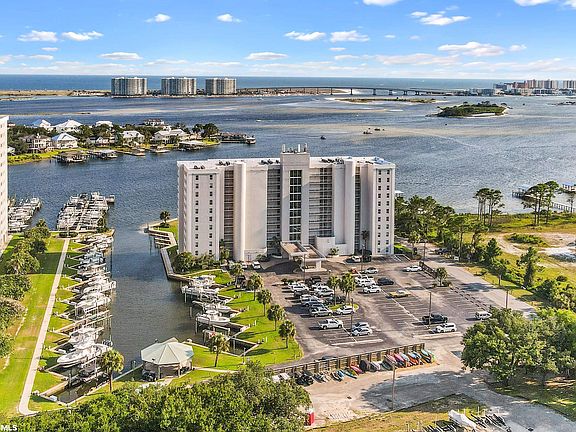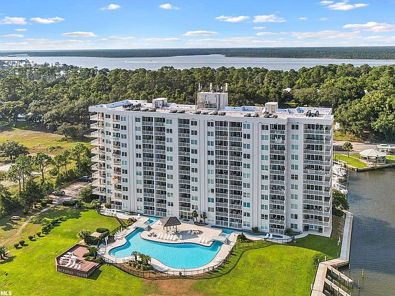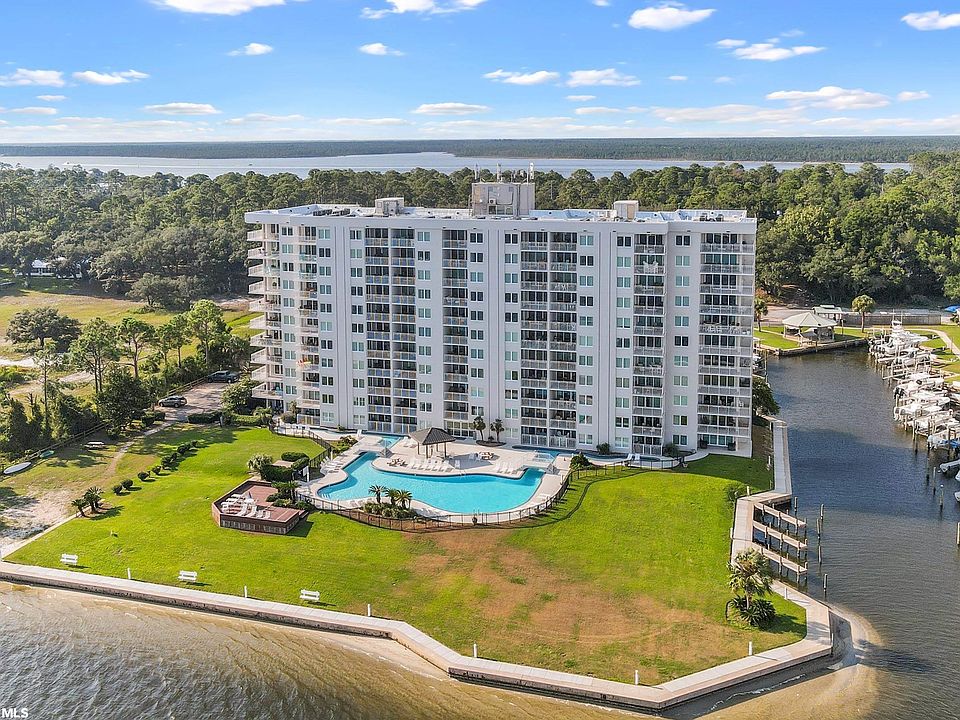 THIS VIEW!!! From the 9th floor of this waterfront unit, the views are endless! Remodeled on the inside (2022) and a compete upgrade on the outside including new windows, sliding doors, elevators and paint (2023), this waterfront complex is one of a kind! Right on Terry Cove, this 2bd/2ba unit boasts LVP floors throughout and an open floor plan that is great for entertaining. Kitchen with new lighting, new appliances and beautiful new quartz counter tops welcomes you for your family meal. Kitchen/dining area has seating for 8. Living room with new shiplap wall and electric reclining sofa and chair invites you to relax after a day in the sun. An oversized master bedroom has spectacular views of Robinson Island as well as direct access to outside balcony. Master bath has newly tiled step in shower, while the guest bath has tub/shower combo. Guest bedroom houses a queen bed with plenty of room for an added air mattress for friends and family. The complex has an oversized pool with a back yard...yes, grass...that is perfect to take the entertainment outside. And don't forget to bring your canoe or paddleboard! The Canoe Trail access is adjacent to the complex. A full marina is on site as well, with boat slips that are deeded by the association for a reasonable fee. Ample boat trailer and golf cart parking on site as well. Don't miss your chance to own a piece of paradise! Seller is licensed agent in the state of Alabama.
