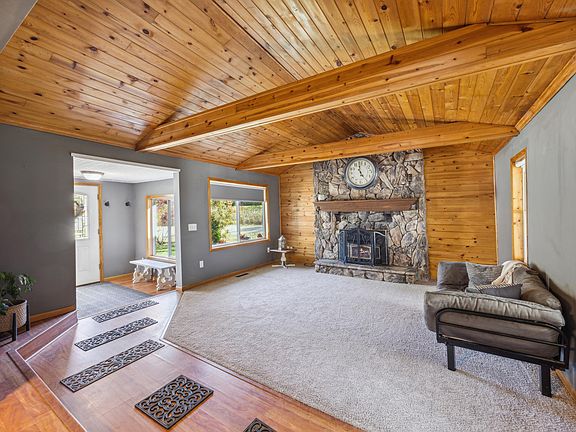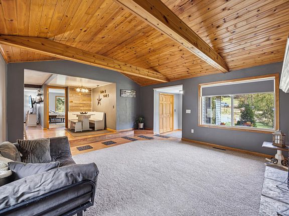 Upon entering, you'll be greeted by the home's vaulted ceilings. Which add a touch of rustic charm. The spacious layout seamlessly flows from the carpeted living areas to the hardwood looking floors in the kitchen and dining spaces. The kitchen boasts ample cabinetry. Providing a functional and inviting workspace.