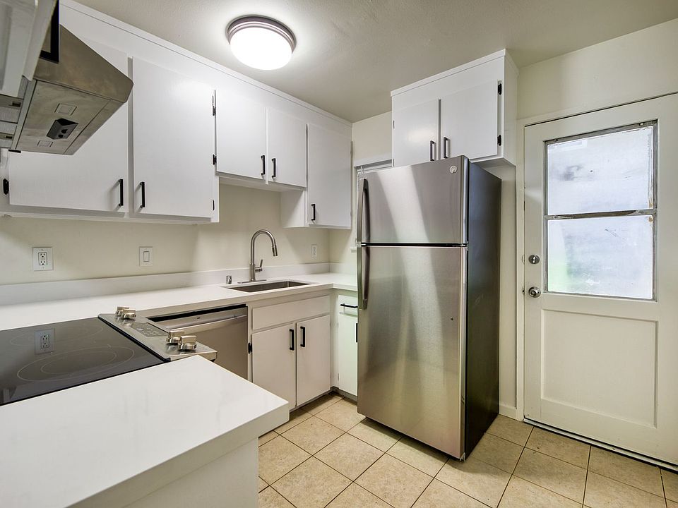 Kitchen with stainless refrigerator, glass-top stove & stainless range hood