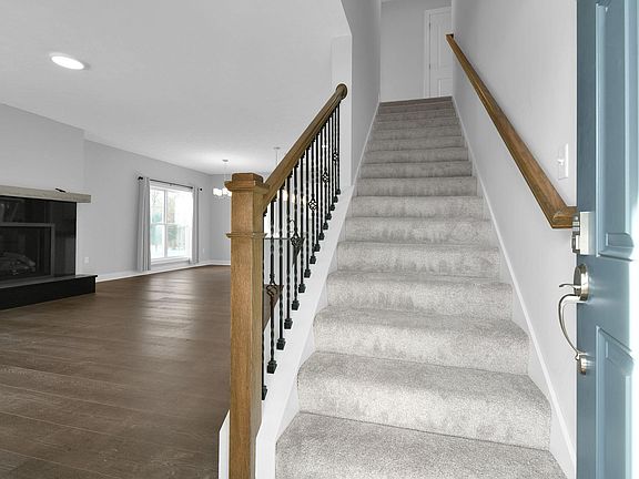 The main level features 9-foot ceilings and a desirable first-floor primary suite with a private full bath, providing convenience and comfort. An open and airy layout flows seamlessly into the living area, highlighted by a gas fireplace with a black granite hearth, creating a warm and inviting focal point.