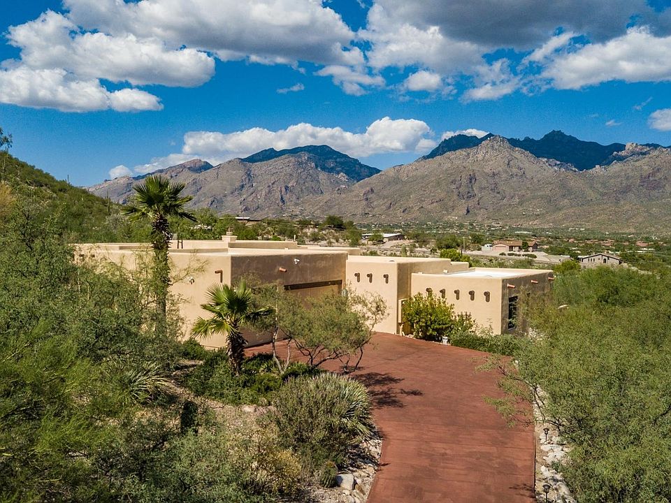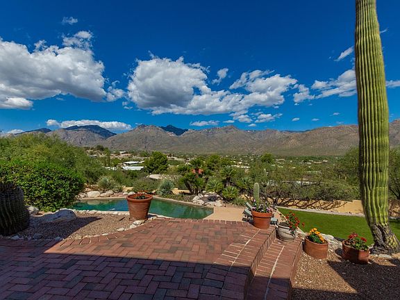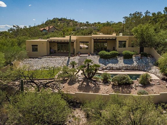 This custom Santa Fe style home was built to take advantage of sweeping mountain views from both inside and outside! Prime location on Tucson's northeast side on almost an acre lot for privacy. The home is set back from the road for a retreat like feel. Well designed split bedroom floor plan. Two bedrooms and bathroom have their own living space separated from the master wing. The main living area offers a great room with beehive fireplace and upscale open kitchen. Walls of windows throughout the home overlooking the dramatic mountains landscaped backyard with pool.