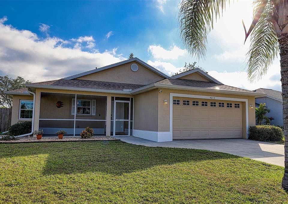Welcome to this meticulously maintained single story, split plan home in the highly desirable Creekwood Community. This beautiful, move-in ready home, has a newly updated kitchen with quartz countertops that effortlessly flow into the dining and living room. Newer refrigerator/freezer 2023 and dishwasher 2022. All windows and sliding glass doors are impact resistant with Low E glass and with the insulated attic you will notice the electric cost savings. Roof 2019 and newer A/C and water heater. All appliances convey. The two car garage has a new garage door opener, as well as, a newly painted floor. The screened lanais in front and back are perfect for entertaining. The large back yard is fenced and has ample space for a pool. Creekwood's amenities include a secured community pool, tennis/pickleball courts, basketball court and picnic table area. There is also a dog park and playgound less then a mile away. You are just a short distance from restaurants, shopping and access to I-75 with an easy commute to St. Petersburg/Tampa or Sarssota and beaches.