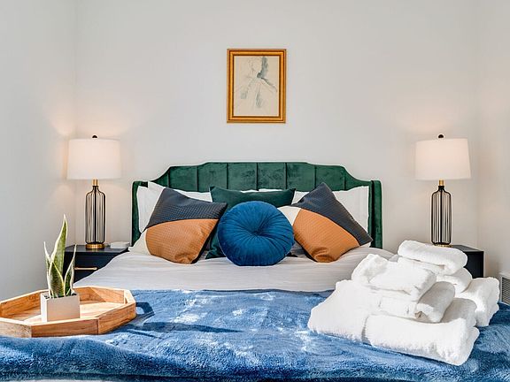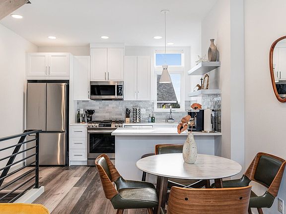Discover Fremont from this modern townhouse in the heart of Seattle's quirky and artistic neighborhood. This 4-story townhome, including a rooftop, offers breathtaking views of the city and Mt. Rainier. With 968 sqft, 2 bedrooms, and 2 bathrooms, feel at home in this tastefully decorated and fully equipped space. The main entrance is on the first floor, with a few steps to access. Welcome to a modern townhouse that is tastefully decorated and fully equipped with all the amenities you need for a comfortable stay. Enjoy the breathtaking views from the rooftop, where you can take in the stunning sights of the city and Mt. Rainier. The kitchen is fully stocked with appliances, cookware, silverware, servingware, spices, and a Keurig coffee and tea maker. The home also features big windows with lots of natural light, a smart TV for streaming, and an onsite washer and dryer for your laundry needs. Dedicated parking is available right behind the home. Well-trained pets are welcome with a fee of $50 per pet. Additional guest fees are $25 per person per night, up to a maximum of 6 guests. Walk just 10 minutes to discover the amazing Woodland Park Zoo or drive 4 minutes to visit the Fremont Troll, Theo Chocolate, Sunday Street Market, and more. With the Space Needle just 23 minutes away and Pike Place Market a mere 25 minutes away, this home is the perfect base for your Seattle adventures. Fremont offers quirky cafes, tech offices, yoga studios, bus lines, fabulous eateries, parks, and lakes, making it an ideal location. This townhome is not handicap friendly and requires comfort with stairs due to its multiple stories. Strictly no parties and events, quiet hours between 10pm-8am, and no smoking or vaping of any kind anywhere on the property, including outdoor areas. A $500 fine applies per violation. Guest access will be granted via a door code. Includes a dedicated desk and chair for remote work in the primary bedroom suite, ensuring a comfortable and productive work-from-home experience. Fast internet is available throughout the home.