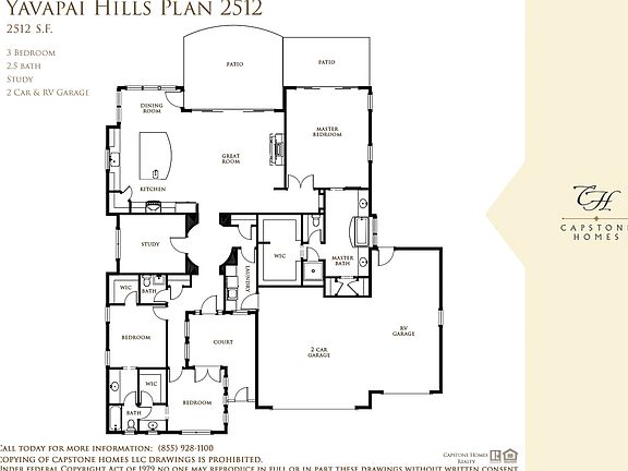 This impressive custom single level residence offers an amazing open concept with a great room that invites you to enjoy a generous covered porch beyond.. The gourmet kitchen with island and walk-in pantry is a cook's dream. Separate bedroom wings create privacy between the charming Jack and Jill bedrooms and an elegant master suite with luxurious bath, walk-in closet, and access to the covered porch. The study can be your creative flex space or an additional bedroom. Welcome friends to enjoy the front courtyard or on your next trip in your RV, conveniently parked in your own RV garage. Capstone Homes offers a myriad of custom floorplans that can be individually designed. Custom home and custom homesite prices vary. Homesite and homesite prep not included in the base price.