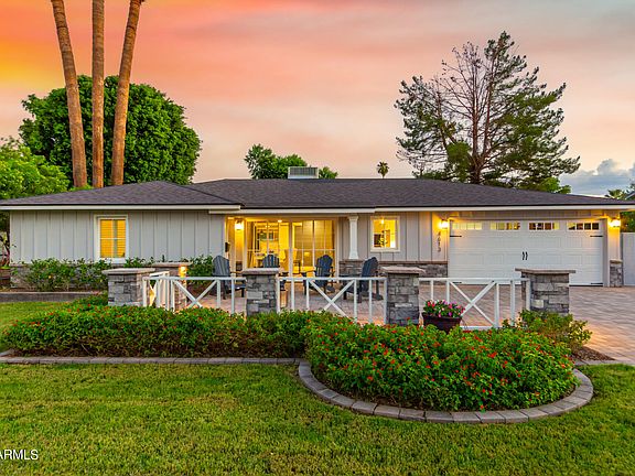 Your dream home is finally here! Welcome to this gorgeous 4-bedroom residence featuring , a paver driveway, an impeccably maintained lawn, elegant stone accents, and a welcoming front patio w stunning Camelback MTN Views. The living room showcases vaulted ceilings, skylights that bathe the space in natural light, a soothing palette, and attractive wood-look flooring. The great room has sliding doors that open to the patio for seamless indoor-outdoor living. The delightful kitchen comes with quartz counters, white shaker cabinets with crown moulding, pendant/recessed lighting, a stylish tile backsplash, a pantry, stainless steel appliances, and an island with a breakfast bar. Completed updated in 2022. Backyard is a relaxing Oasis, pool, covered patio and private. See additional comments The primary bedroom offers direct backyard access, a lavish ensuite with dual vanities, a soaking tub, a luxurious raindrop shower, and a walk-in closet. The second master with its ensuite bathroom is perfect for multi generational families or older children. The enchanting backyard is perfect for enjoying sunsets, boasting covered patios, a barn shed for extra storage, pristine natural turf, and a sparkling pool for endless summer fun. The back yard is watered w SRP flood irrigation, and the front yard is on a newly installed sprinkler system.