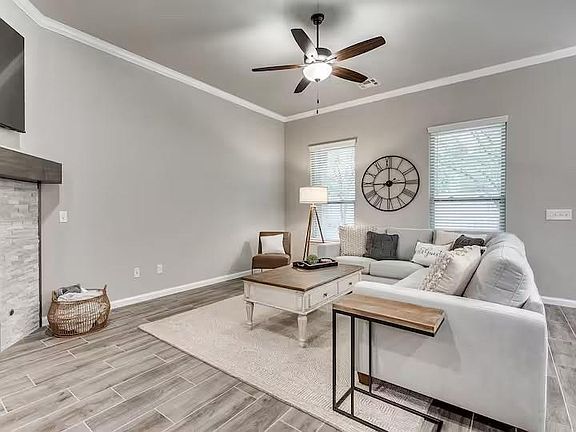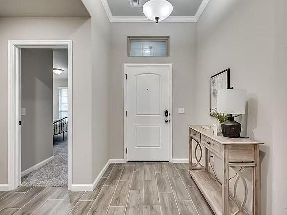 Charming & Modern Home Near OU – Built in 2021! Welcome to this beautifully maintained home offering modern comfort, stylish finishes, and an unbeatable location just minutes from the University of Oklahoma, popular restaurants, and convenient highway access. Built in 2021, this home blends charm and efficiency with an open-concept layout that’s great for everyday living and entertaining. Step inside to a seamless flow between the entry, living, dining, and kitchen areas, all unified by elegant wood-look tile flooring and crown molding. The spacious living room features a cozy gas log fireplace, a ceiling fan, and windows that fill the space with natural light. The chef’s kitchen is sure to impress, boasting a 5-burner WiFi-enabled gas stove, built-in microwave, pantry, and a large island with breakfast bar, sink, and dishwasher—ideal for gatherings and meal prep alike.