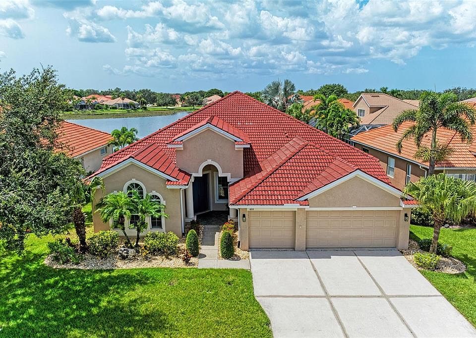Luxurious upscale home with gorgeous water views in the gated community of Mandalay. One of the largest floor plans in the community, this 3,083-square-foot home includes 4 bedrooms plus bonus room/5th bedroom, 4 full bathrooms, private office/den with French doors with new laminate flooring, 3-car garage, split floor plan, inside laundry room with shelving for extra storage and utility sink, large kitchen with breakfast nook/dinette and a screened-in heated swimming pool with covered lanai area. This home has many great updates which include energy efficient impact hurricane rated windows and sliding doors with plantation shutters, new first-floor 5-ton AC unit and upstairs brand new AC unit, new kitchen appliances and fresh interior paint. As you walk through the front door you will notice the spotless home with bright natural light, high ceilings, spacious open living area, high-quality crown molding, recessed lighting, lighted ceiling fans and a split floor plan for privacy for your guest. The gorgeous chef's kitchen is outfitted with new LG stainless steel appliances, granite counters, 42" cabinets with pull out drawers, under cabinet lighting, beautiful glass tile backsplash, food prep island, breakfast bar, closet pantry, walk-in storage closet and dinette with amazing water views of the pond and pool area behind the home. Off the main living area, step into the large primary bedroom retreat with an en-suite bathroom, luxurious garden bathtub, walk-in shower, dual sinks, separate toilet room, large walk-in primary closet and a French door that opens up to the large pool area. The office/den in the front of the house is perfect for arts and crafts, home office or a game room. You will also find 2 guest bedrooms with a shared bathroom. In the back of the home, the 4th bedroom has a walk-in closet and an en-suite bathroom that has a door leading to the pool area. There is plenty of space for entertaining in the beautiful dining and family room too. Upstairs, enjoy the spacious bonus room/5th bedroom with wide open water views of the pond, full bathroom and walk-in closet. This room could also be used for a game room or additional office space. The heated swimming pool is great for fun and entertainment for family and friends. Within the screened pool area, you will find a covered patio with plenty of space to soak in the sun for a perfect tan. Mandalay has low HOA fees, no CDD fees and is located only minutes away from University Town Center Mall, fine dining restaurants, grocery stores, Sarasota Airport and the sugary sand beaches on the Gulf. This home has it all. Call to schedule your showing today to view this amazing home.