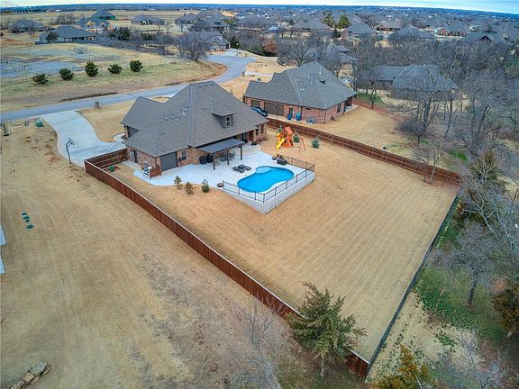 This stunner in sought after Riata Ranch greets you w/an open floor plan w/wide plank hardwood floors, 5" white base & is open to the living & dining areas.Working from home? 1 office downstairs & the upstairs media rm could dbl as a 2nd office.This 1.4 mol acre lot extends past the ravine & wooded area for added seclusion & that woodsy feel.The 2018 inground salt water pool w/tanning ledge is surrounded by wrought iron fencing and accented by a maintenance free pergola & extended patio for optimal entertaining & family gatherings.There is still plenty of fenced & sprinkled yard to play.All 3 bedrooms are spacious with a huge upstairs bedroom, full bath PLUS office/media/2nd living area.Cozy up in the living w/floor to ceiling rock gas fireplace & E facing windows for lots of natural light.The master w/seasonal WI closet,long jetta tub & double vanities round out this amazing home.EZ access to major Hwys to TFAB, Will Rogers Airport, FAA, OKC, Boeing, Hospitals, Norman, Bricktown & Okc