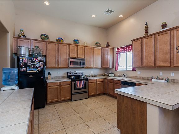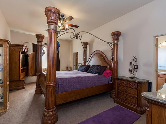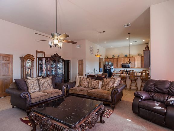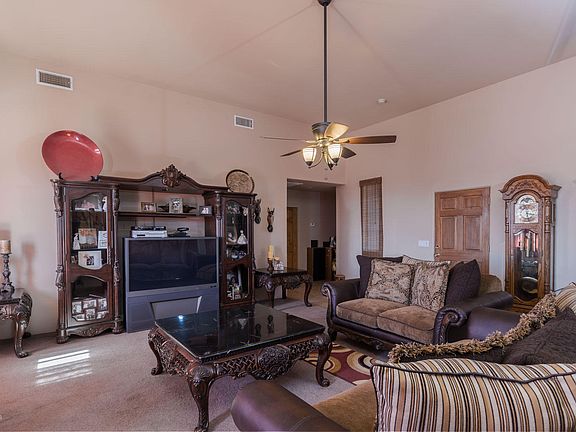 Beautiful semi-custom Santa Fe on 1 acre with fantastic mountain views surrounding. Featuring an open floor plan, perfect for entertaining with maple cabinetry, tile floors throughout, brand new carpet in bedrooms, large master ensuite with his and hers vanities, walk in shower and garden tub, fresh paint, lots of storage, extended three car garage, private entry into den, brand new well with only two well shares...this one truly has it all!