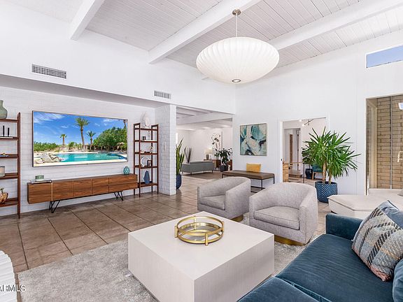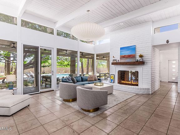 A VERY COOL, mid century modern property situated in an active and vibrant location nestled near the base of Camelback Mountain. Exudes a unique vibe, fun living space in a superior location. Surrounded by other remarkable homes, this fantastic pocket area of real estate in Arcadia has captured attention & admiration of everyone. The area is experiencing a surge in building activity, with several very large homes recently constructed. For the nature lover this gem is a dream come true. Towering trees, even a rare tall Boojum tree, lush foliage & majestic mountains create a breathtaking backdrop. Designed in a mid-century modern-organic style, lending a light, airy, and bright ambiance. Natural light floods in at every angle, illuminating the living spaces, creating an inviting atmospher Step into the recently remodeled kitchen which exudes Mid Century Modern, sophisticated vibe. The kitchen is a culinary enthusiast's delight, offering new appliances, sleek quartz countertops, shelving and ample storage space. Enjoy the double sided fireplace while cooking or dining. The master retreat is a sanctuary of relaxation, with a cozy fireplace, separate sitting room, luxurious soaking tub, his & hers closets and exit to a private patio area.