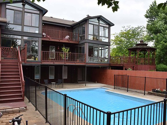 Picturesque 5 acre setting only 14 miles from downtown Louisville. Absolutely charming 3 bedroom/3.5 bath home with easy transition into a full 5-bedroom. With 4114 finished square feet, this offering features new hardwood floors in family room and kitchen, and a new a/d unit (June 2014). Open main level has 2 bedrooms, large full bath with double vanity, entry with French doors and skylight, family room with built in's, two sun rooms overlooking the property, and an eat-in kitchen. Level two features spacious multi-use loft area, half bath with laundry, master bedroom suite with cedar-lined walk-in closet, bedroom 4, and two more sun rooms. Lovely views of grounds and pool that is within a courtyard setting - encased by larger concrete and stone walls that encircle wrought iron gate. Extensive decking on main level connects to gazebo and overlooks all, and a full patio on lower level to enjoy fun at the pool. Finished walkout basement has plenty of room for living area/man cave, pool-changing room or 5th bedroom, full bath, 2 large storage areas - one with built-in's, 80 gal water heater, 2nd washer/dryer hookup. Outbuilding could serve a variety of purposes - boat and jet ski storage, work room.... Stone surround entrance to property. Attached garage plus large driveway pad for additional parking. Do not miss seeing this one.