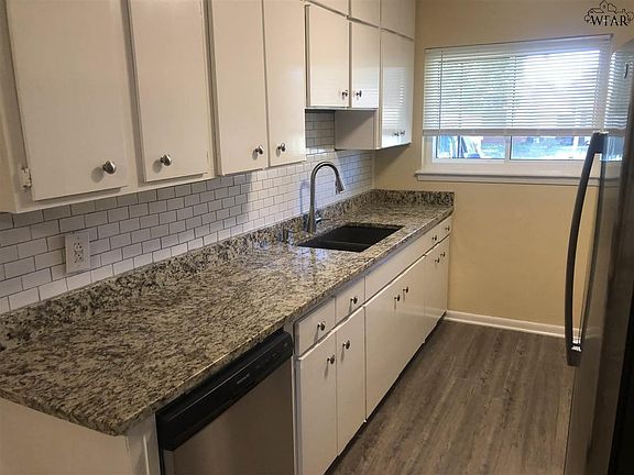 Beautiful updated brick home with 3 bedrooms, 1 1/2 baths, 2 living areas with all new flooring and paint, new granite countertop with new stainless dishwasher and gas cooktop / oven. Also includes newer stainless side by side fridge and vent a hood. Double pane windows, large back yard with mature trees. Large separate laundry room and 1 blockl walking distance to Lake Wichita and city park. Nice view of the lake from the backyard. Owner / agent