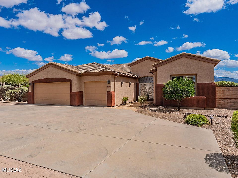 Welcome to your fully furnished home oasis in a highly desired gated community! With an amazing view of the Santa Rita Mountains your large low-care backyard offers space to barbecue or unwind on the covered patio. The home's interior is open & welcoming, w/tile throughout the living spaces. The kitchen has plenty of cabinets & counterspace! With both a family room and formal dining/living room, this home is perfect for everyday living & entertaining. You'll also appreciate the split floorplan; all bedrooms accommodate a king bed! The enormous owner's bedroom w/soaking tub & walk-in closet gives the space a suite-like feeling. Other bonuses include: 3-car garage w/utility sink, water softener, access to Green Valley Recreation Centers. Bring your personal belongings & start living!