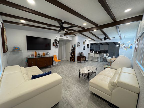 Unique exposed beam ceilings in the great room, kitchen, and 2 of the bedrooms. All new paint, tile, plumbing and LED electrical fixtures. All new concrete patios all around the home and 3 sets of sliding glass doors make for great entertaining. A fully upgraded kitchen with new cabinets and appliances, new countertops, pot filler above stove, garbage disposer in sink, stainless high-powered range hood for the most discerning chef.