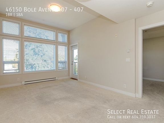Address: 407-46150 Bole Ave Date Available: September 1, 2025 This bright, open concept 1 bedroom 1 bathroom apartment is located on the top floor with a beautiful northern view of the mountains. Close to shopping, recreation, medical services and a only short walk from the newly redeveloped downtown Chilliwack. The open concept kitchen has plenty of cabinet space and stainless appliances which include a fridge, range, dishwasher and over the range microwave. The unit also boasts in suite laundry, 2 parking stalls, & 1 locker Lease Details Lease duration: 1 Year Deposit: Months Rent. Pet Deposit: Months Rent. No Smoking Property Details Bed: 1 Bath: 1 SQFT: 579 Pet Details Pets(Yes/No): No Type Allowed: Dog / Cat Number: 0 Size Restriction: Less than 12" at the shoulder fully grown Exterior Details BBQs allowed(yes/no): No Parking type and how many: 1 Garage, 1 Courtyard Yard Usage: NA Yard fully fenced: NA Shed Or Shop Usage: No Appliances Included Fridge: Yes Range: Yes Dishwasher: Yes Microwave: Yes Washer/Dryer: Yes Shared Laundry: No Pay Laundry: No Fireplace: No Air conditioner: No Standalone freezer: No Utilities Gas: NA Hydro: 100% Tenant Internet/Cable: 100% Tenant Water, Sewer, Garbage: Included Utility Type Heat Source: Electric Baseboard Septic/Sewer: Sewer Water Source: City Tenant Responsible for Septic pumping: No Strata Age Restriction: No Storage Locker: NA Move-in/out Fee: $75.00 Move in Scheduling: Notice Required Features: Fully gated courtyard Underground parking Walking distance to shopping and restaurants All levels of schools nearby. District 1881 walking distance. Amenities Climate control, Controlled access, Courtyard, Dishwasher, Dryer, Garage parking, Hardwood floors, Heat, Linen closet, Microwave, Mirrors,, Private patio, Refrigerator, Stove and oven, Vinyl floors, Walk-in closets, Washer, Wheelchair accessible, Window coverings