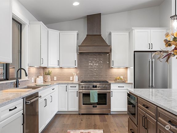 Beautiful new 2,936 SF home with tranquil water views and a 4 car tandem garage . Main level includes large primary suite with view, spa-like bath, and its own laundry area. Also including a study/bedroom 2, bedroom 3, full bath, kitchen/dining/great room area with French doors leading to a view deck. Large covered rear deck with outdoor fireplace. Downstairs includes large family room with wet bar/laundry room/bedroom & full bath. Designer selected finishes throughout. Fenced in yard is irrigated & fully landscaped. One of just three gorgeous homes by Landed Gentry at Anaco Beach.