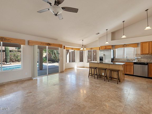 Gorgeous Ryland Home in desirable Tatum Ranch! This sought after floor plan has 3 bedrooms, 2 baths, large living spaces and a 2-car garage. A feeling of spaciousness is created by the vaulted ceilings and lots of natural light. Travertine floors complement the main living areas. The open concept kitchen boasts a large island, a casual eating area, beautiful granite counters, tile backsplashes and stainless-steel appliances. Kitchen area flows seamlessly into the family room which has a built-in entertainment center. At the end of the day, one can retreat into the relaxing environment of the main bedroom with high ceilings, an all-tile walk-in shower, double vanity area and large closet. The nice-sized backyard is an oasis with an updated pool and north/south exposure. A must see!!!