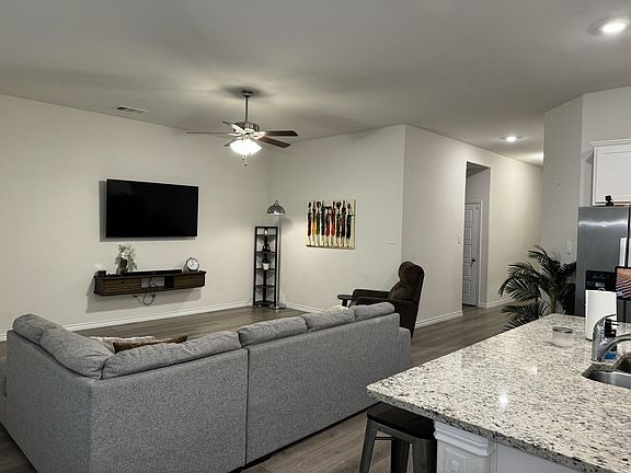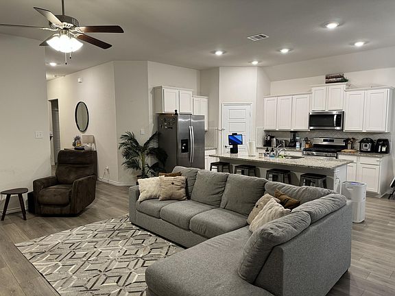 Step into this delightful 4-bedroom, 2-bathroom home boasting 1,855 square feet of living space. With charming stone accents and hardwood floors, it offers a warm ambience. The open layout is perfect for gatherings, leading to a well-equipped kitchen with granite countertops. The primary bedroom features a spacious walk-in shower. Three additional bedrooms offer flexibility. Outside, enjoy the large covered patio and fenced backyard. Fridge is included. Plus, enjoy nearby amenities such as the PGA golf course, HEB, upcoming Kroger, Sprouts, Target and Universal Studios. Welcome home! Owner pays for lawn. Renter is responsible for water, gas and electric. Last month's rent is due at signing. No smoking allowed.